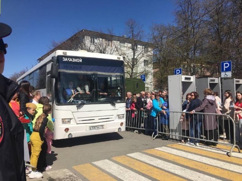 На нескольких автобусах, в сопровождении машины скорой помощи, на площадь привезли ветеранов и детей войны. Их усадили на почетные места.