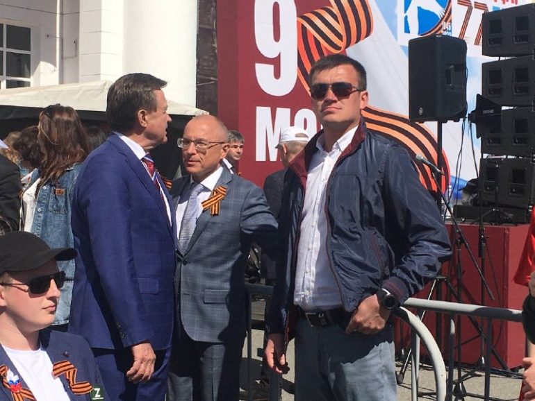 Экс-мэр Ульяновска Сергей Ермаков пришел на парад в форме. Сергея Николаевича встретили как почетного гостя, уседили в первые ряды.