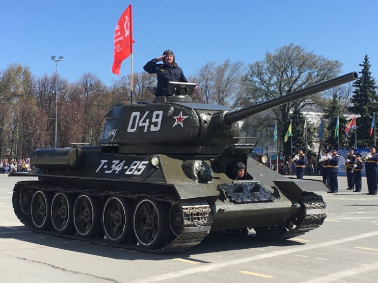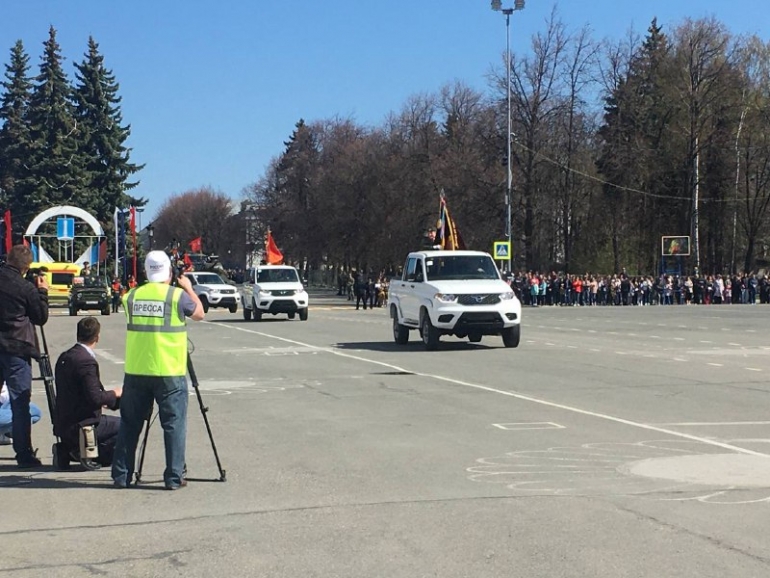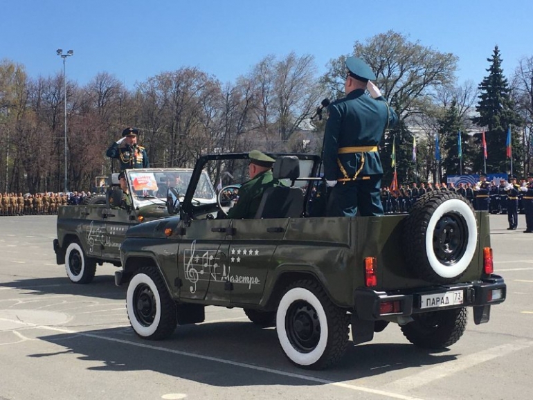 По площади проехали УАЗ Hunter, специально выпущенные к празднованию 70-летия Победы. Принимал парад начальник Ульяновского гарнизона полковник Дмитрий Бадаев.