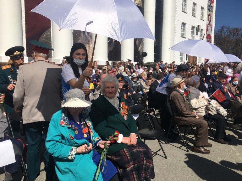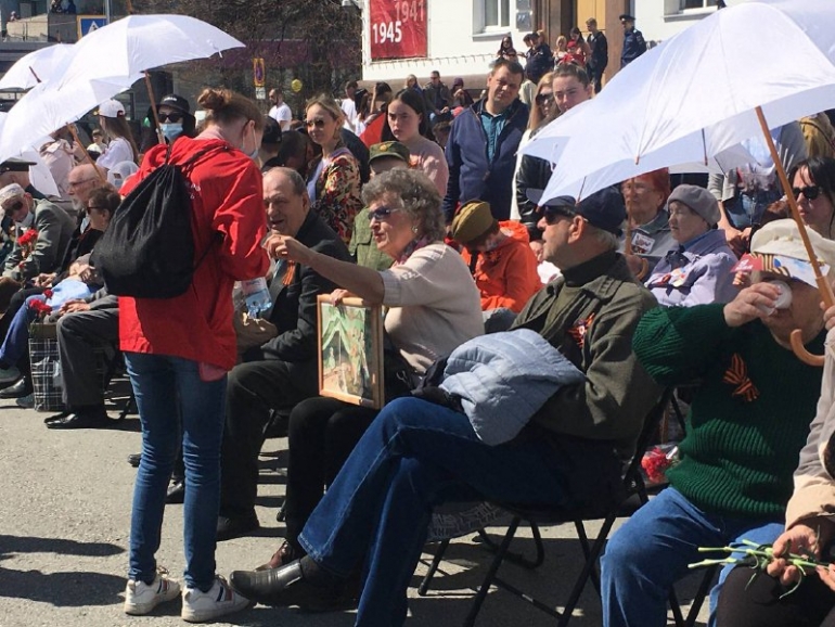 От жаркого солнца волонтеры Победы закрывали ветеранов и детей войны зонтиками.