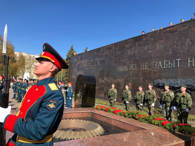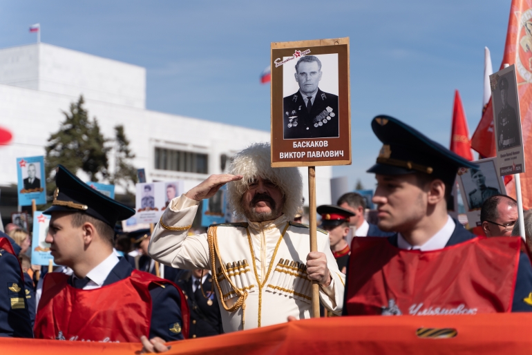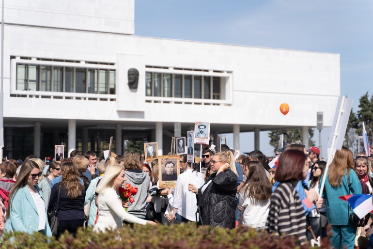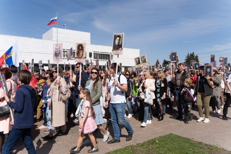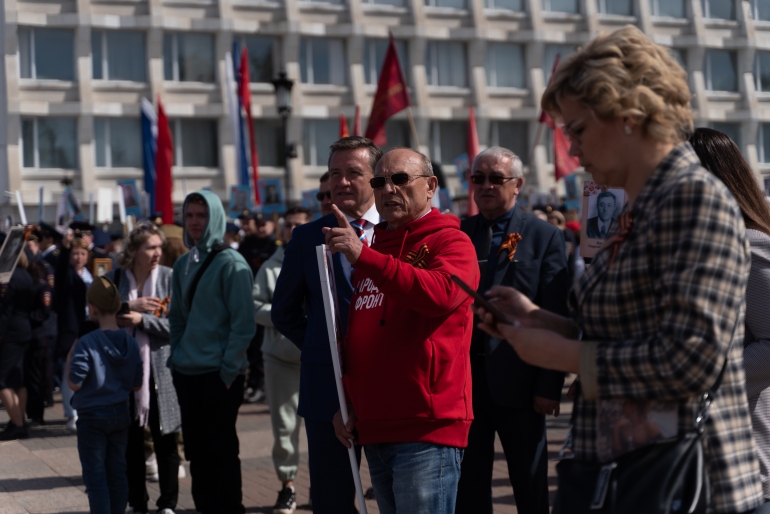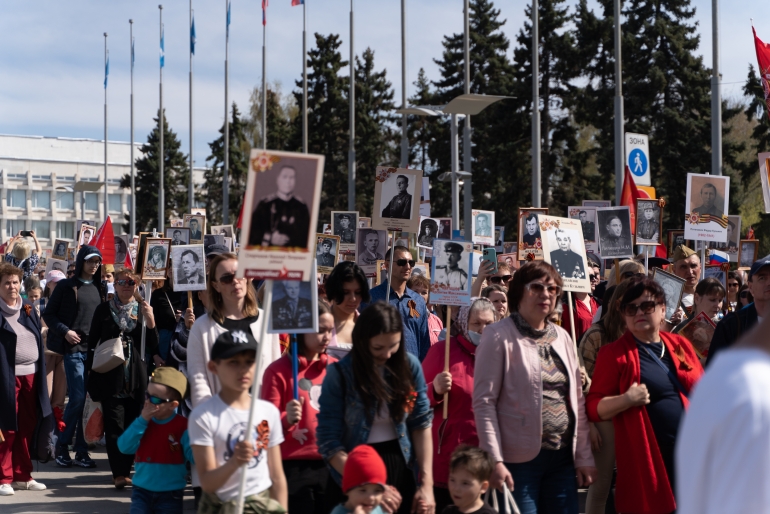 Колонна растянулась больше, чем на километр. Первые ряды уже шли по Гончарова, замыкающие только-только отходили от мемориала. Люди пели «Катюшу», скандировали «С днем Победы!».