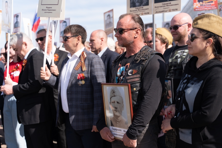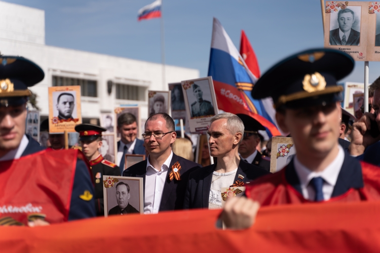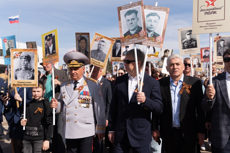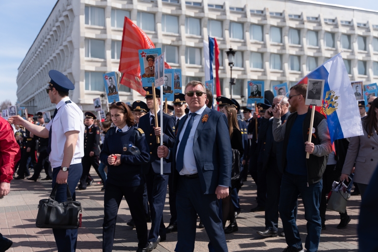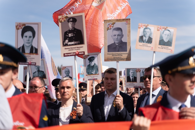 Губернатор Алексей Русских шел в середине колонны. Глава региона нес портреты двух своих дедушек. Владимир Степанович Конкин, дедушка по маме, был тружеником тыла, металлургом, всю жизнь трудился в горячем цеху на Ижстали, лил сталь для танков. Второй — Василий Андреевич Русских, был танкистом, воевал в советско-японскую войну.