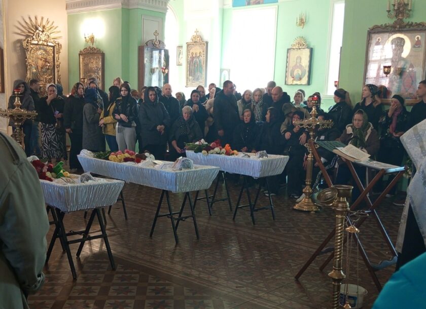 В храме было около 200 человек. Люди стояли плотно, многие молча, с опущенными головами. У гробов — игрушки, цветы, фотографии.