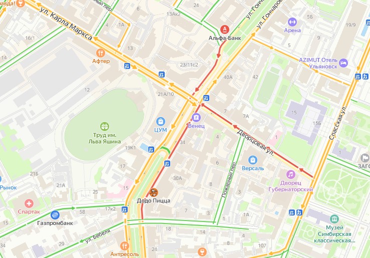 Пробка на улице Гончарова в обе стороны по пути к Дворцовой, где также «стоят» авто. Аналогичная ситуация на улице Карла Маркса — сервис Яндекс.Карты показывает там ДТП.