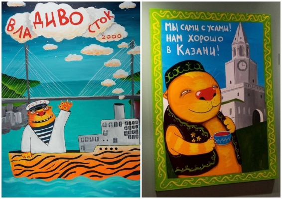 Вася Ложкин известен своим талантом превращать города в узнаваемые мемы. Его рыжие коты уже стали визитными карточками многих регионов. Например, Владивосток он изобразил через кота-капитана на фоне Золотого моста с подписью «ВлаДИВОсток 2000», а Казань предстала в образе упитанного кота в тюбетейке с фразой-мантрой: «Мы сами с усами! Нам хорошо в Казани!».