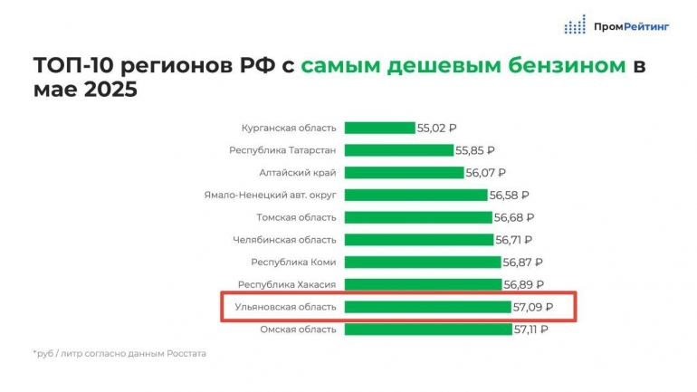 В мае 2025 года индекс потребительских цен на автомобильный бензин по сравнению с апрелем составил 100,49%. Регион все еще удерживается в десятке регионов с самым недорогим бензином, хотя несколько месяцев назад скатился на девятую строчку.