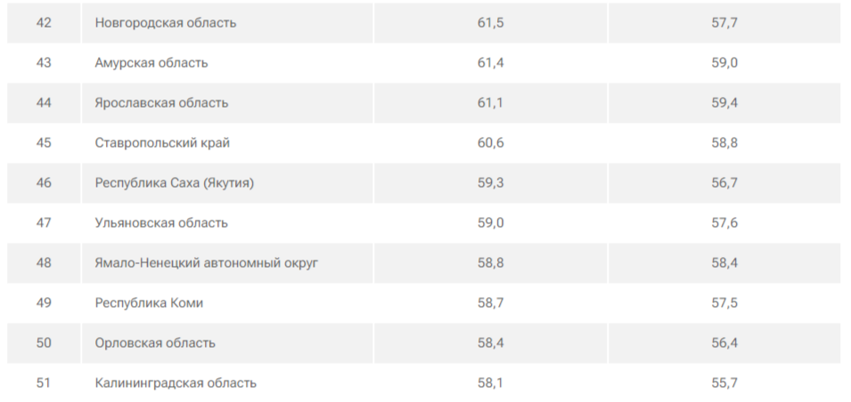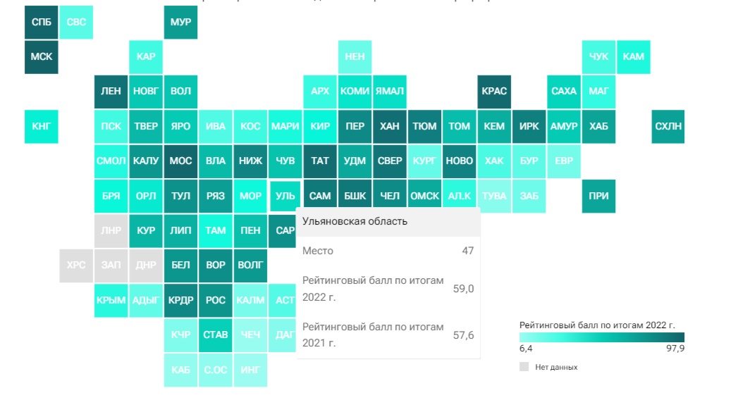 Ульяновская область располагается на 47 месте. По итогам прошлого года регион улучшил свои показатели - он набрал 59 баллов против 57,6 годом ранее.