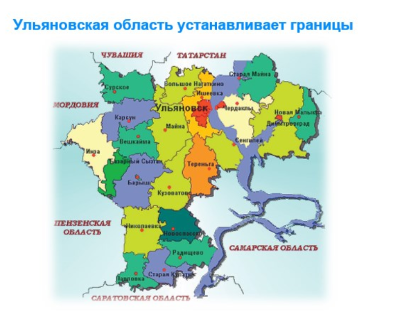 Ульяновская область граничит с шестью соседними регионами. Это Республика Мордовия, Республика Чувашия, Республика Татарстан, Пензенская, Самарская и Саратовская области.