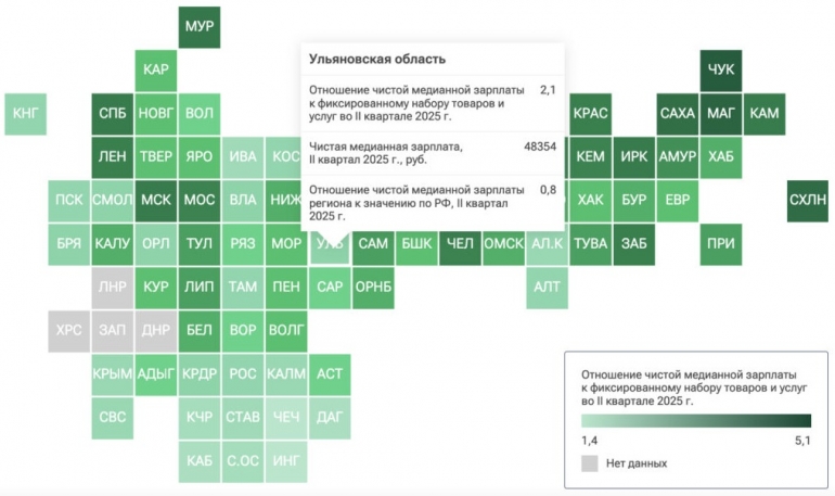 По итогам второго квартала 2025 года, чистая (после вычета НДФЛ) медианная зарплата в Ульяновской области составила 48 354 рубля. Это составляет 80% от среднероссийского показателя. Этих денег хватит на покупку 2,1 стандартного потребительского набора товаров и услуг. В среднем по стране этот показатель равен – 2,6. Во втором квартале 2025 года средняя номинальная начисленная заработная плата в России почти достигла 100 тысяч рублей, что на 16% выше, чем за аналогичный период прошлого года.