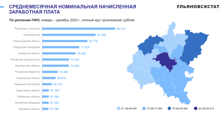Согласно официальным данным, среднемесячная номинальная начисленная зарплата в Ульяновской области составляет 69 676 рублей. Лидеры рейтинга – Республика Татарстан (90 515 рублей), Пермский край (83 646 рублей) и Нижегородская область (80 778 рублей).