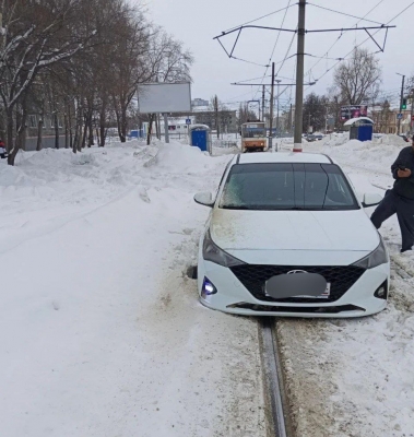 Автомобиль застрял на выделенных путях. Движение в сторону парка Юности было закрыто, вагоны доходят только до Северного Венца.