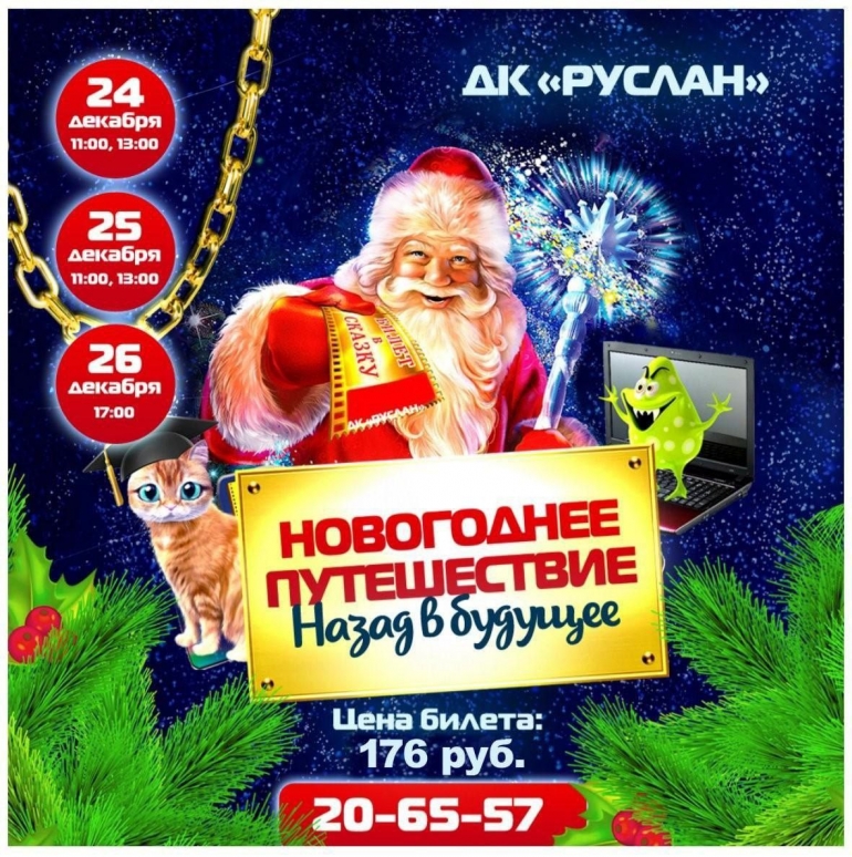 Также ДК «Руслан» представит спектакль «Новогоднее путешествие – назад в будущее». Его покажут 24 и 25 декабря в 11:00 и 13:00, а 26 декабря – в 17:00.