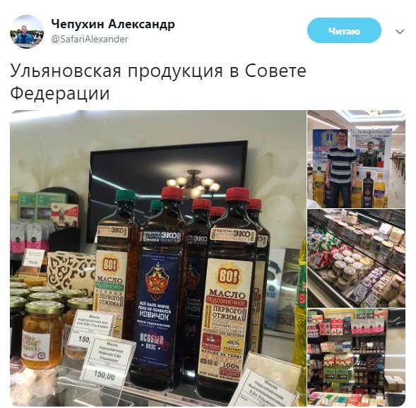 Депутат заксобрания Александр Чепухин выложил фоторепортаж из столовой Совфеда, где представлена продукция из Ульяновска: подсолнечное масло "Новичок" местного фермера и звезды программы "Пусть говорят" Алексея Якушева, пряники Фаины Самарцевой ("УльяновскХлебпром) и шоколад Миланы Приваловой под брендом "Симбирский артизан", кисло-молочные продукты и пр.