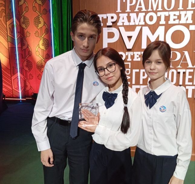 Ученица 7 класса Мария Мурзакова, ученик 9 класса Роман Сибилев и ученица 11 класса Ангелина Журавлева из ульяновской гимназии № 33 стали победителями интеллектуально-развлекательной программы «Мы — грамотеи!» на телеканале «Культура»