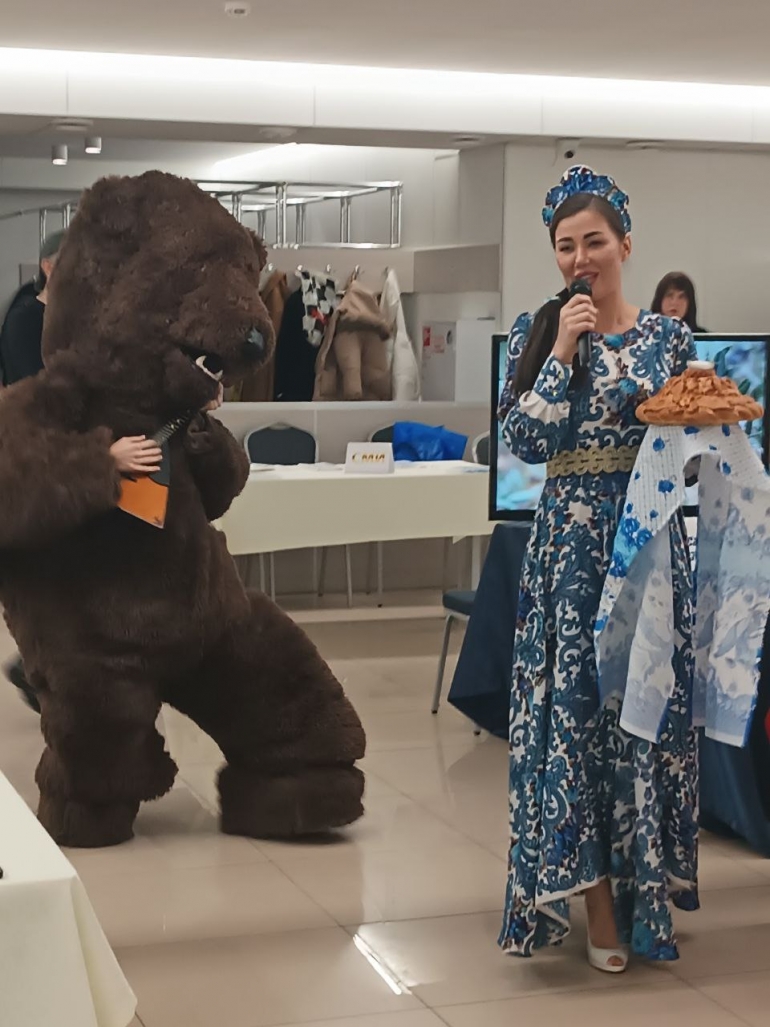 А Юлия Кузьмина в русском народном костюме и кокошнике пустилась в пляс под балалайку с медведем.