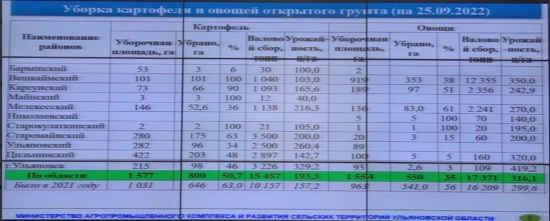Глава агропрома Михаил Семенкин доложил, что из-за локальных дождей уборочная кампания отстает, но находится в графике. В целом урожайность выше по сравнению с прошлым годом. 50% овощей уже убрано, что на 18% выше показателей прошлого отчетного периода. Цены ниже осени 2021-го. В настоящее время озимых убрано 97%, благодаря осадкам они идут на всход.