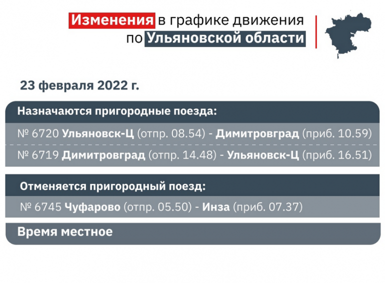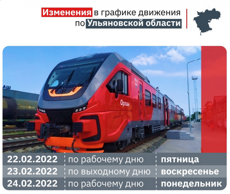 Башкортостанская пригородная пассажирская компания сообщает, что в связи с празднованием Дня защитника Отечества вносятся изменения в график движения пригородных поездов по Ульяновской области.