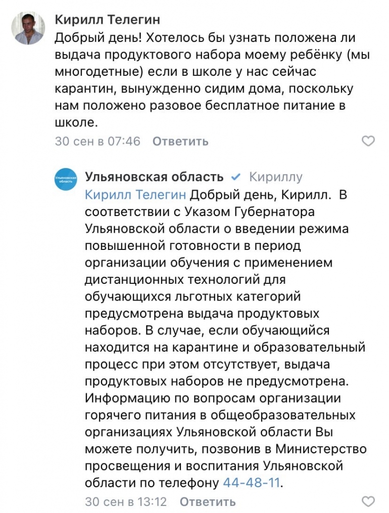 Неделю назад обеспокоенные жители начали бомбить Центр управления регионом - нуждающиеся в питании льготники его не получили. Чиновники заявили: выдача продуктовых наборов не предусмотрена, если образовательный процесс на карантине отсутствует, только при наличии дистанционки.