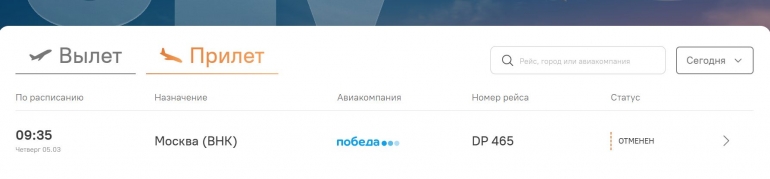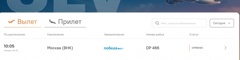 Был отменён рейс из Москвы и обратно, которые должны были выполняться авиакомпанией «Победа».