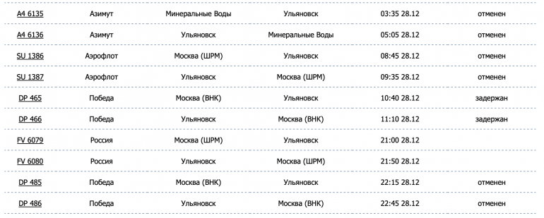 По даным Росавиации, ульяновский аэропорт закрыли в 1.29 и открыли в 5.30 28 декабря. В настоящий момент отменены или задержаны практически все рейсы, назначеные на сегодня.