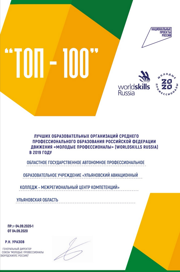 Ульяновский авиационный колледж – межрегиональный центр компетенций, расположенный на проспекте Созидателей, вошёл в топ-100 лучших организаций среднего профессионального образования РФ, которые реализуют мероприятия и проекты движения «Молодые профессионалы» (WorldSkills Russia).