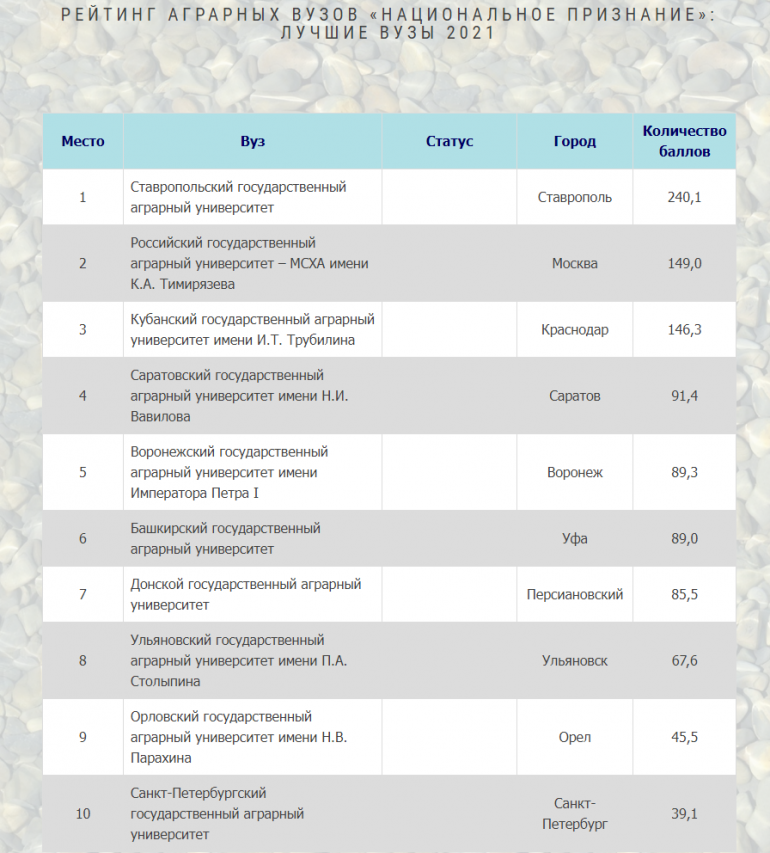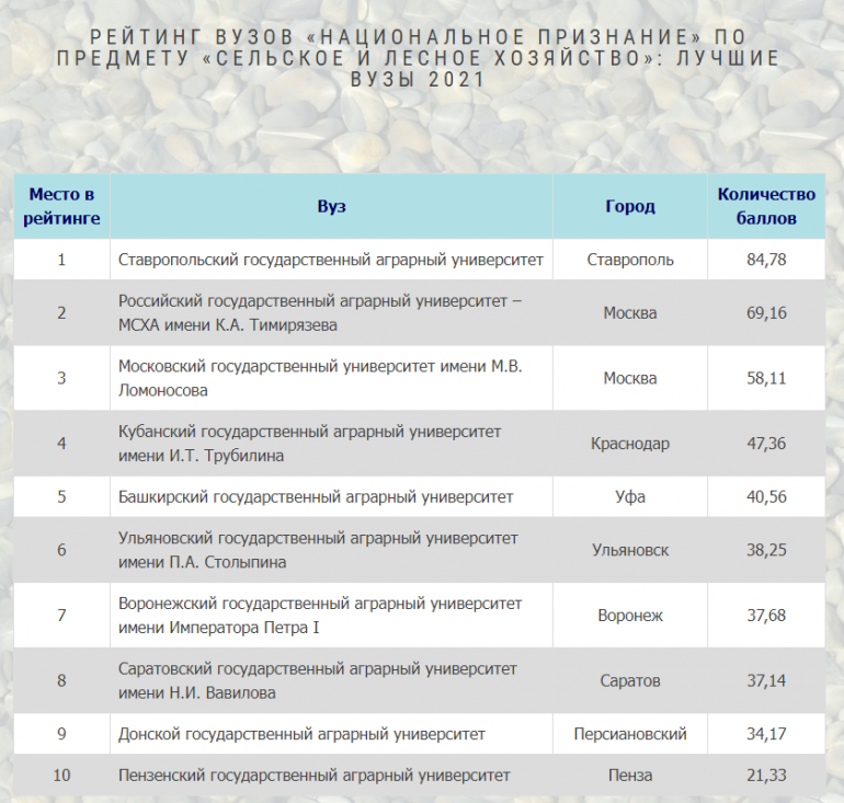 В список аграрных вузов РФ Ульяновский ГАУ вошел в десятку лучших высших учебных заведений, заняв 8 место.