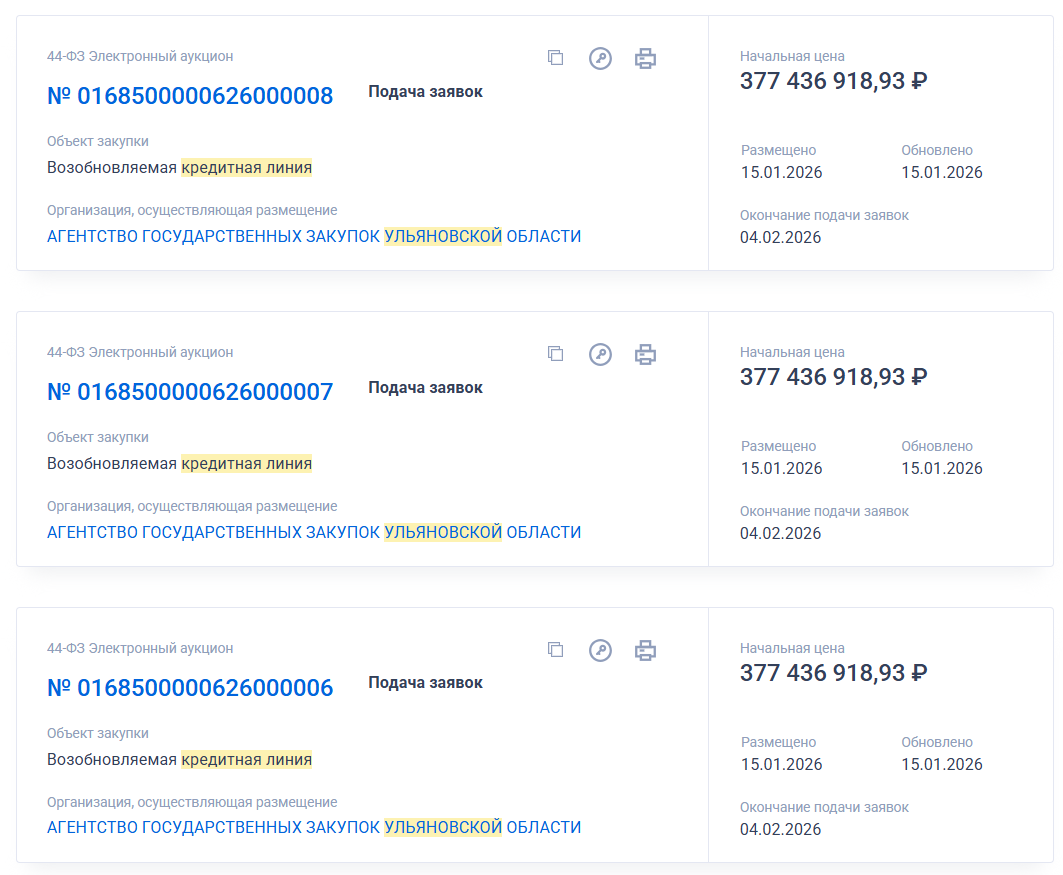 Заемщиком выступает Министерство финансов Ульяновской области — всего опубликовано три карточки контракта. По условиям, услуги будут оказываться в течении 730 дней с даты начала исполнения контракта.