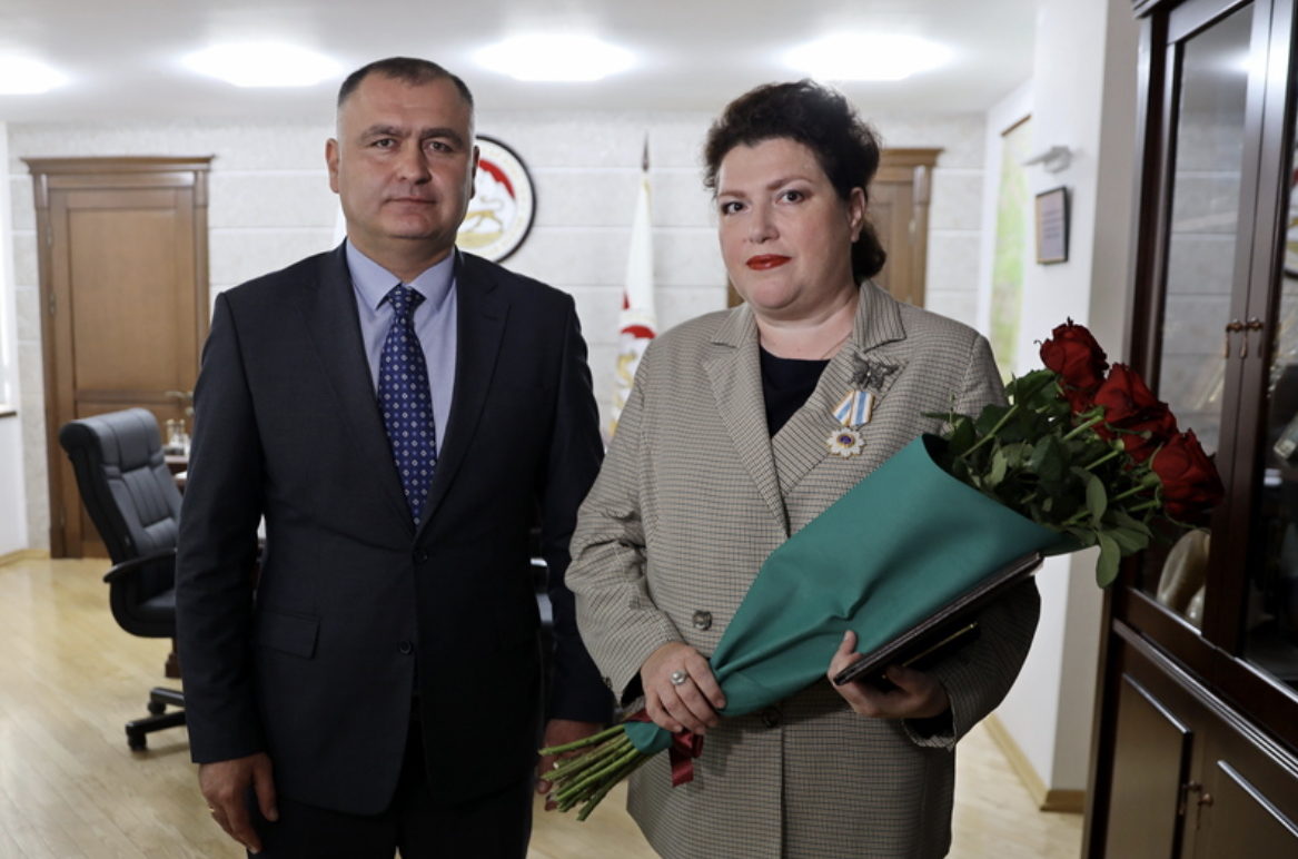 Гаглоев наградил Сидорову Орденом Дружбы за большой вклад в развитие южно-осетино-российского сотрудничества в области культуры.