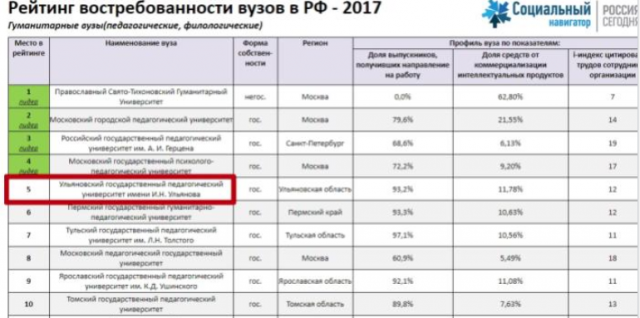 Ульяновский государственный педагогический университет им. И.Н. Ульянова вошел в ТОП-5 рейтинга востребованности вузов в РФ-2017. Он занял среди 69 гуманитарных университетов страны пятое место.