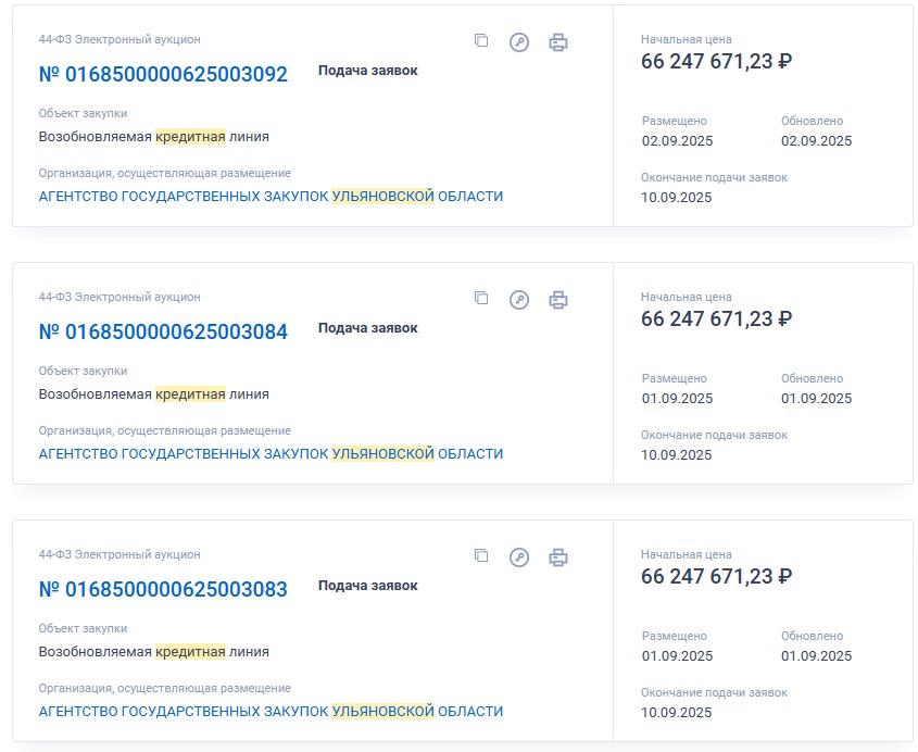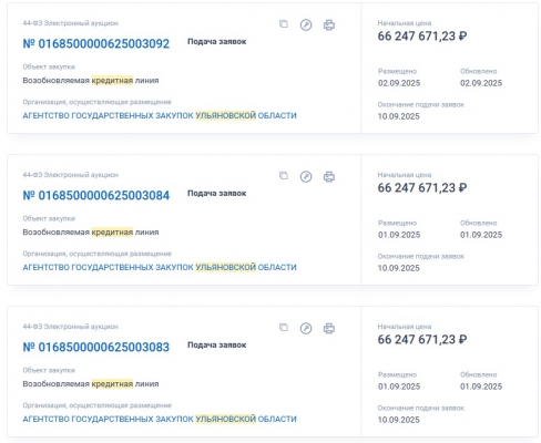 На портале ЕИС «Закупки» 1 сентября начался этап подачи заявок в формате электронного аукциона, предметом которого является возобновляемая кредитная линия. Министерство Финансов Ульяновской области разместило три заявки, каждая из которых на один млрд рублей. Подача заявок завершится 10 сентября.