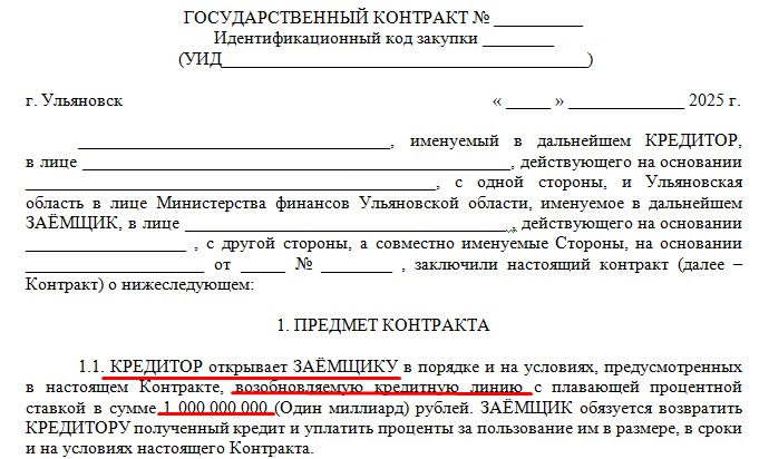 Согласно контракту, кредитор открывает заемщику — Ульяновской области в лице Минфина, возобновляемую кредитную линию с плавающей процентной ставкой в сумме один миллиард рублей. Дата начала исполнения контракта — первый календарный день с момента его заключения. Срок исполнения — 122 дня с момента подписания.