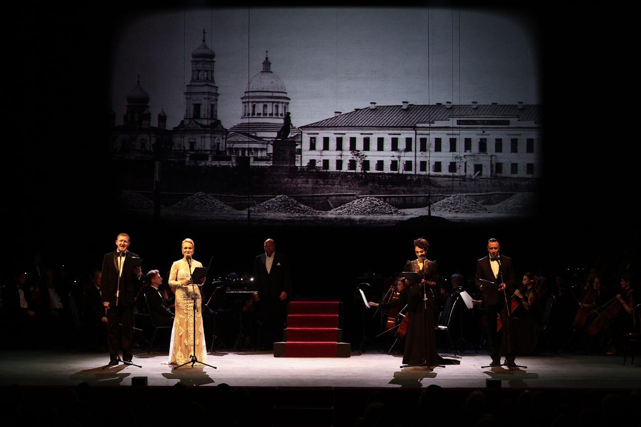 На сцене две пары ведущих — Максим Копылов, Юлия Ильина, Николай Авдеев и Оксана Романова рассказали и показали 240-летнюю историю симбирского-ульяновского театра драмы, входящего в десятку старейших в России. Отрывки из спектаклей разных веков и лет — от «Леса», «Последней жертвы» и «Грозы» Островского до «Трёх сестёр» Чехова — сопровождал живой музыкой Ульяновский государственный академический симфонический оркестр. Актёр Александр Курзин перевоплотился в знаменитого комика симбирской драмы XIX века Пузинского, прославившегося исполнением... женских ролей. Молодая актриса Валерия Шевченко появилась на сцене в образе блиставшей на симбирских подмостках в начале прошлого столетия Софьи Голлидэй, очень близкой подруги Марины Цветаевой. Вспомнили и театральную эпоху Юрия Копылова. В отрывке из его спектакля «Двенадцатая ночь» роль дворецкого Мальволио сыграл актёр и режиссёр улдрамы Копылов-младший.