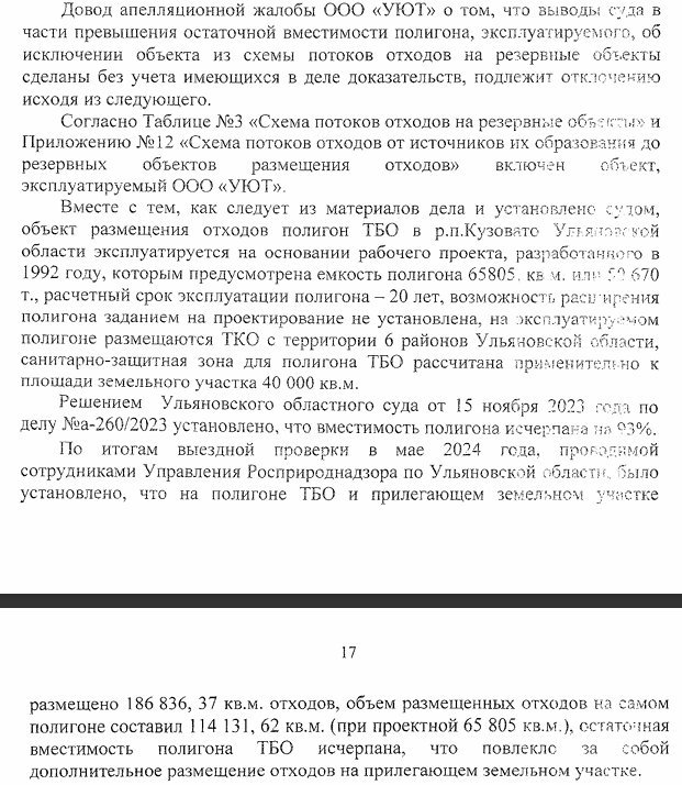 В итоге согласно судебной документации, мощность полигона ООО «Уют» в Кузоватово (пятая зона, обслуживает Кузоватовский, Николаевский, Новоспасский, Радищевский, Старокулаткинский и Павловский районы) признана исчерпанной.