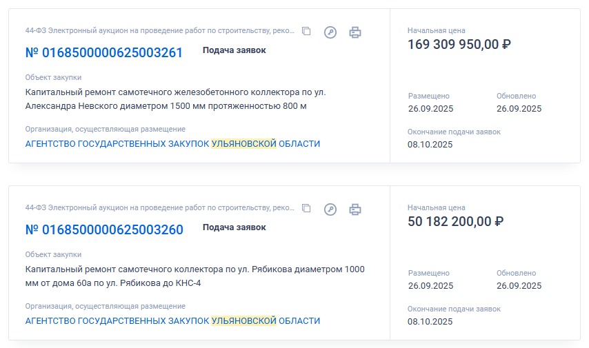 На портале ЕИС «Закупки» появилась карточка электронного аукциона на капитальный ремонт двух самотечных коллекторов диаметром в 1,5 и 1 метра за 219,5 млн — оба объекта находятся в Засвияжском районе.