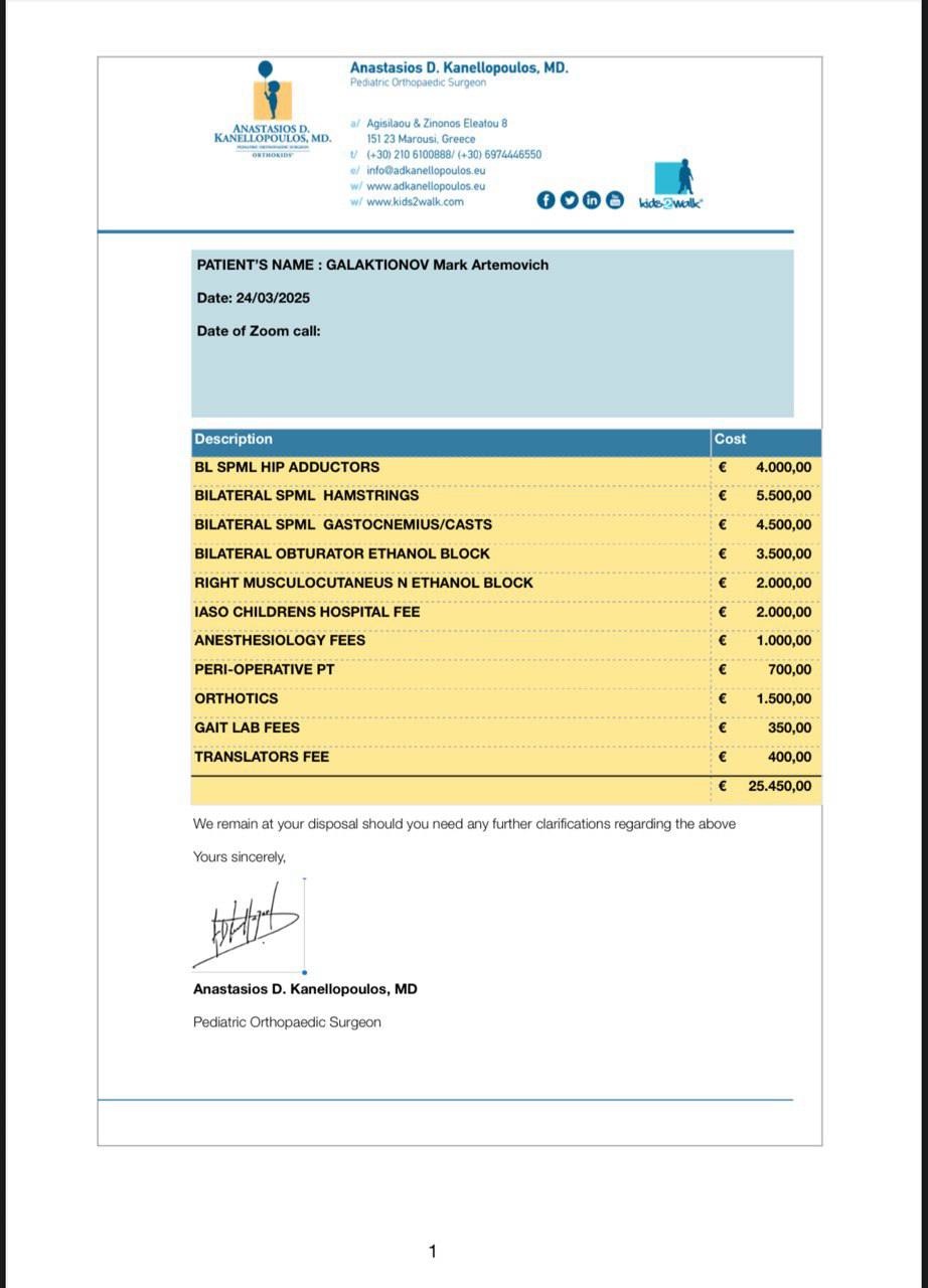 Стоимость лечения - 2 545 000 рублей. Это сумма только на оплату операции. Внести предоплату — 20 000 евро — нужно уже 27 октября.