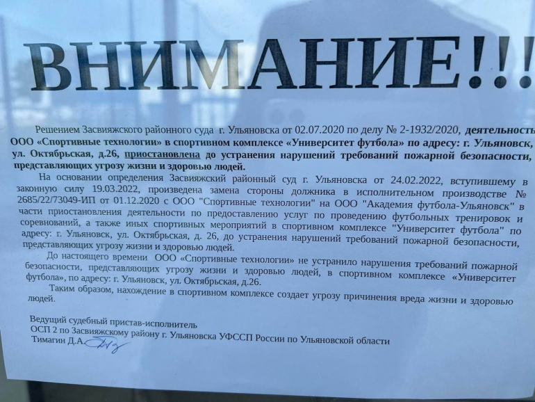 «Университет футбола», расположенный в Ульяновске на улице Октябрьской, закрыли приставы. Об этом сообщает телеграм-канал «Симбирский шугожор».