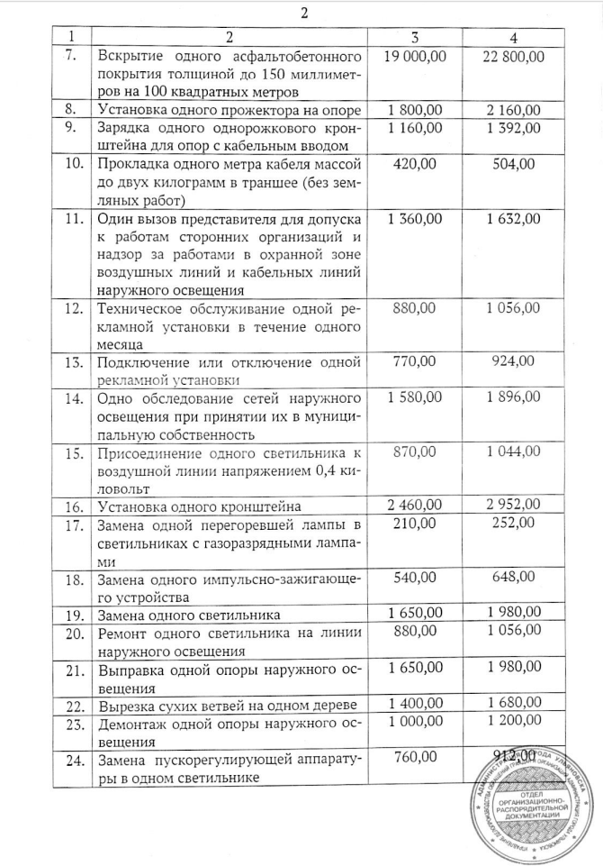 Также в прайсе рассчитана стоимость услуг на рытье траншей, установку прожекторов, обслуживание рекламных установок, замену и ремонт светильников, обрезку сухих веток, демонтаж опор освещения, почасовую работу спецтехники и обследование сетей освещения.