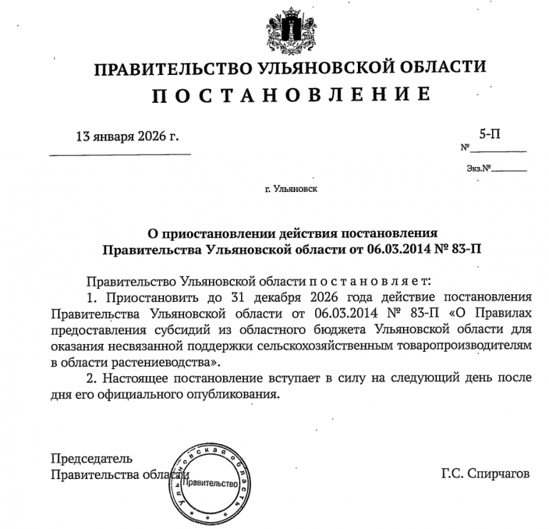 Правительство Ульяновской области опубликовало постановление о приостановлении действия документа о предоставлении субсидий из областного бюджета до 31 декабря 2026 года.