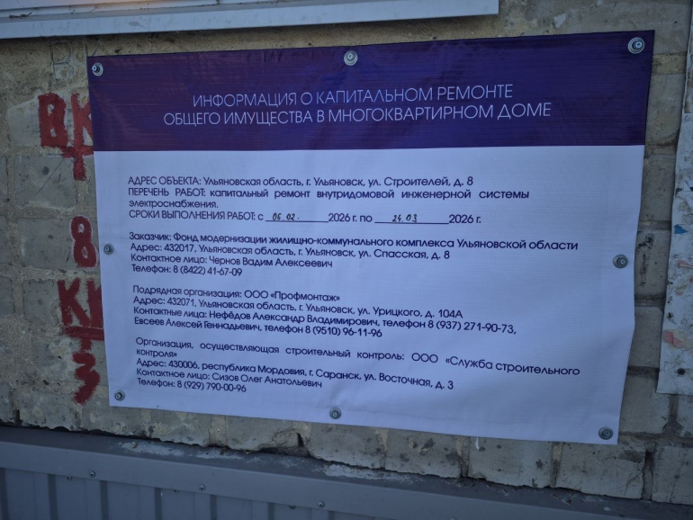В перечне объектов – кирпичная монолитная девятиэтажка по улице Строителей, 8 в Ульяновске. В этом году в доме 1975 года постройки обновляют систему электроснабжения. В прошлом году здесь отремонтировали крышу, а в 2022-м – впервые со времени ввода дома в эксплуатацию поменяли лифт. В этом году очередь дошла до электрики.
