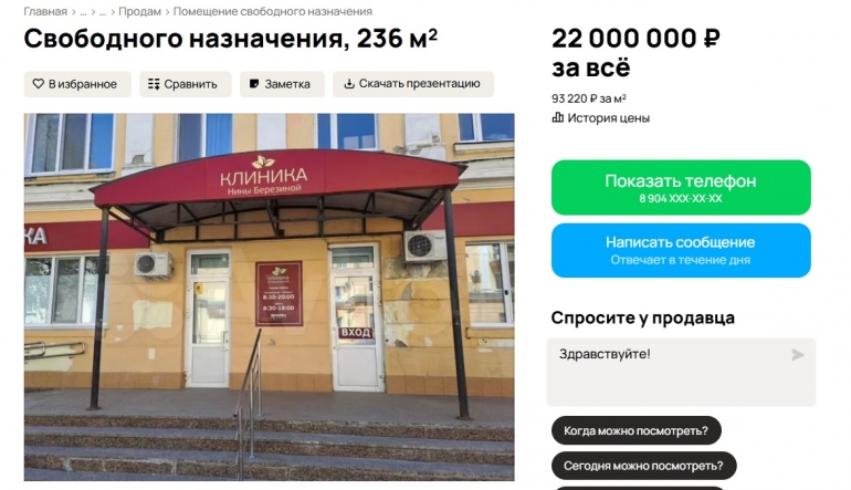 Объявление о продаже появилось на «Авито» в конце прошлого года. Тогда помещение на первом этаже пятиэтажного жилого дома выставили за 23 млн рублей и через месяц снизили цену на миллион рублей. В объявлении отмечается, что продаваемое помещение площадью 236 кв. м. находится в центре города — в районе с развитой инфраструктурой и высокой проходимостью. Оно сдано в долгосрочную аренду, обеспечивающую стабильный пассивный доход. Ежемесячная плата за аренду составляет 145 тыс. руб. Срок окупаемости, по расчетам продавца, составит около 12 лет.