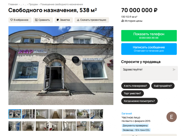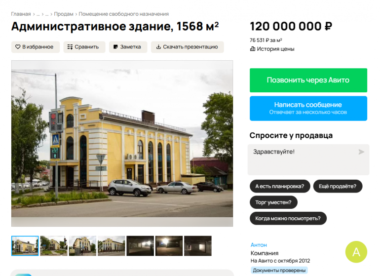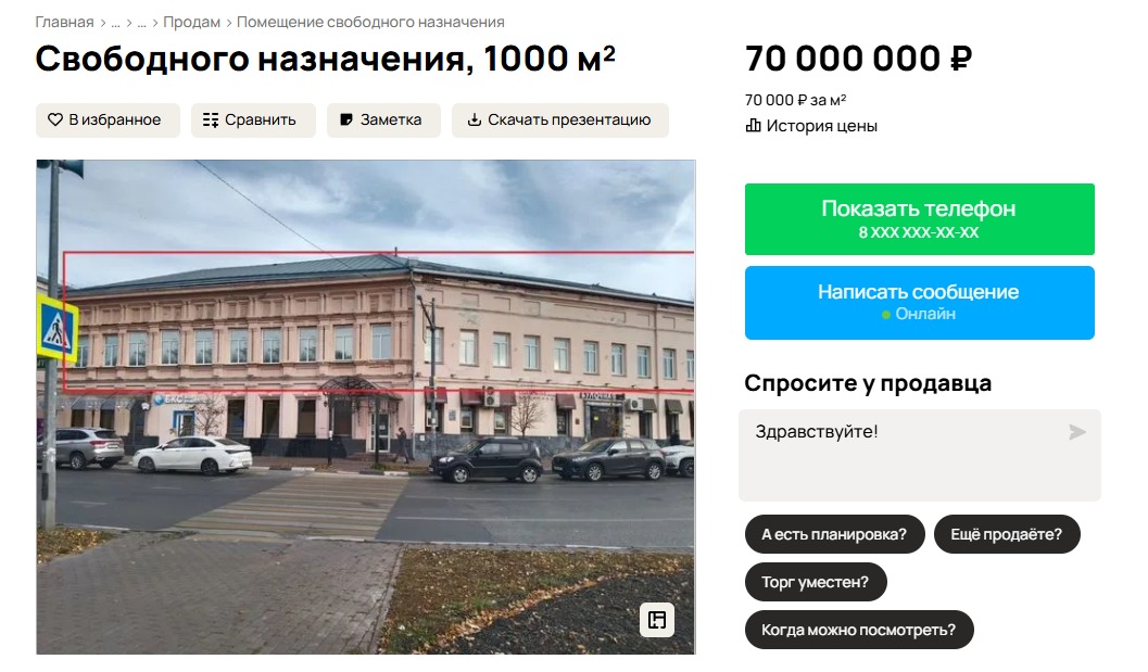 На площадке «Авито» опубликовали объявления о продаже нескольких зданий в центре города на общую сумму 260 млн рублей