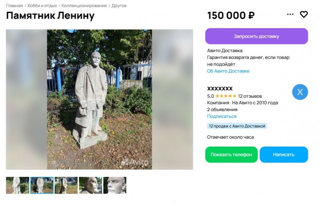На «Авито» появилось объявление о продаже каменного памятника Владимиру Ленину в рабочем поселке Чердаклы — вождя мирового пролетариата «оценили» в 150 тысяч рублей.