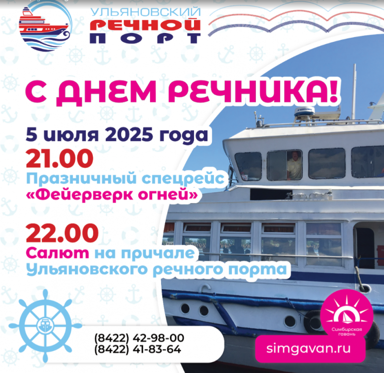 День работников морского и речного флота традиционно отмечается каждое первое воскресенье июля. Накануне праздника в 21.00 Ульяновский речной порт запускает вечерний рейс с салютом.