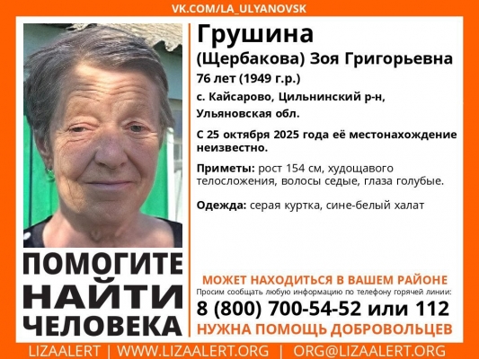 76-летняя Зоя Грушина (Щербакова) пропала сегодня, в селе Кайсарово Цильнинского района.