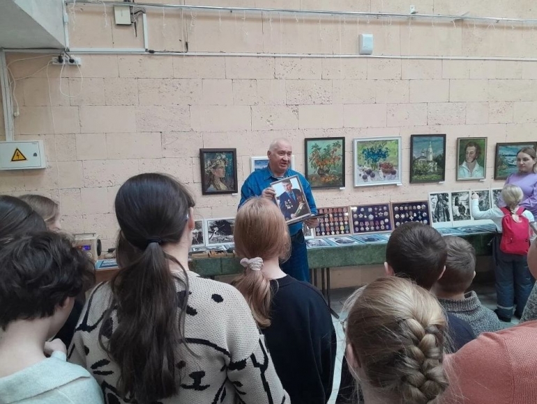 Особый интерес у ребят вызвала выставка боевых орденов и медалей, а также экспозиция линогравюр, посвященная героям нашего края. Также в ДШИ прошел концерт с авторскими песнями и стихами.