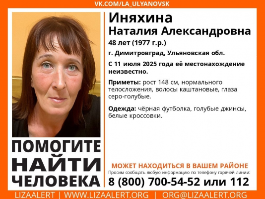 В ульяновской области 11 июля ушла из дома и до сих пор не вернулась 48-летняя жительница города Димитровграда Наталья Иняхина.