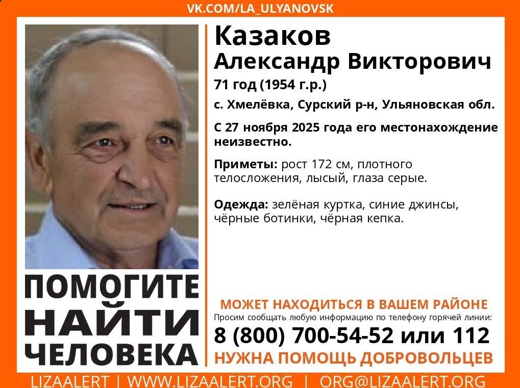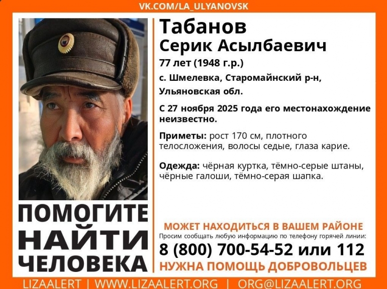 В Ульяновской области 27 ноября пропало два человека – 71-летний Александр Казаков из села Хмелевка Сурского района и 77-летний Серик Табанов из села Шмелевка Старомайнского района.