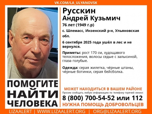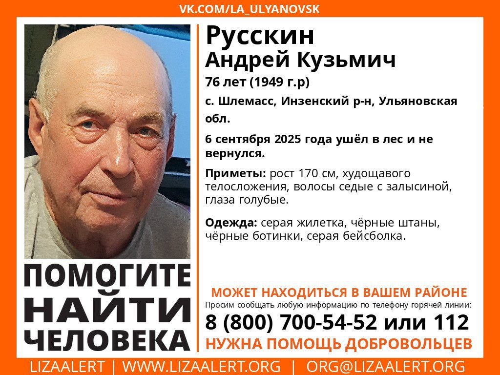 В Инзенском районе ищут Андрея Русскина, который пропал 6 сентября. Его приметы: рост 170 см, худощавого телосложения, волосы седые с залысиной, глаза голубые. Был одет в серую жилетку, чёрные штаны, чёрные ботинки, серую бейсболку.