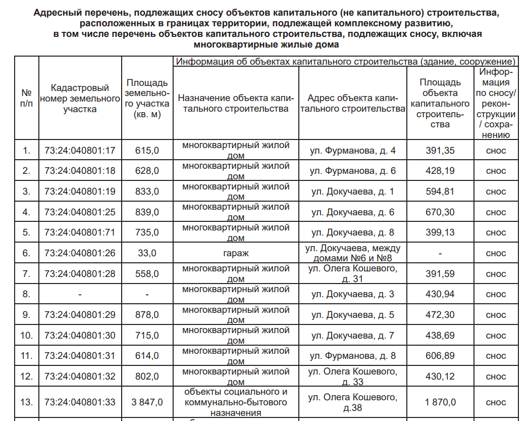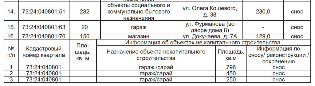 Как ранее писал 73online.ru, застройщика определят путем проведения открытого аукциона. Согласно проекту решения, он должен обеспечить за свой счет разработку документации по планировке территории, взяв за основу согласованный мастер-план, подготовку проектной документации на снос объектов капитального строительства, возведение домов (не более 16 этажей), дошкольного учреждения (не менее 60 мест), парковки. Также потребуется создать или приобрести жильё, чтобы предоставить его гражданам взамен освобождённых помещений. Указывается, что площадь новых квартир должна быть не меньше прежних. Планируемый срок расселения и строительства – десять лет.