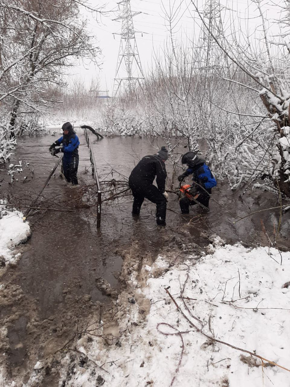 На Сельди спасатели убирают брёвна и ветви деревьев от пешеходного мостика в посёлке Дачный, чтобы они не создали здесь затор во время второй волны паводка.